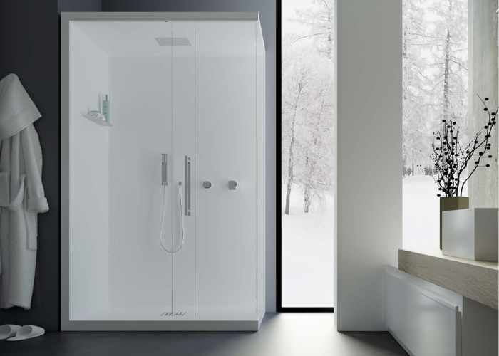 Grazie ai pannelli di rivestimento in composito tech con finitura esterna bianco seta, è possibile installare la doccia con bagno turco in qualsiasi parte del bagno: ad angolo, a nicchia o in centro parete.